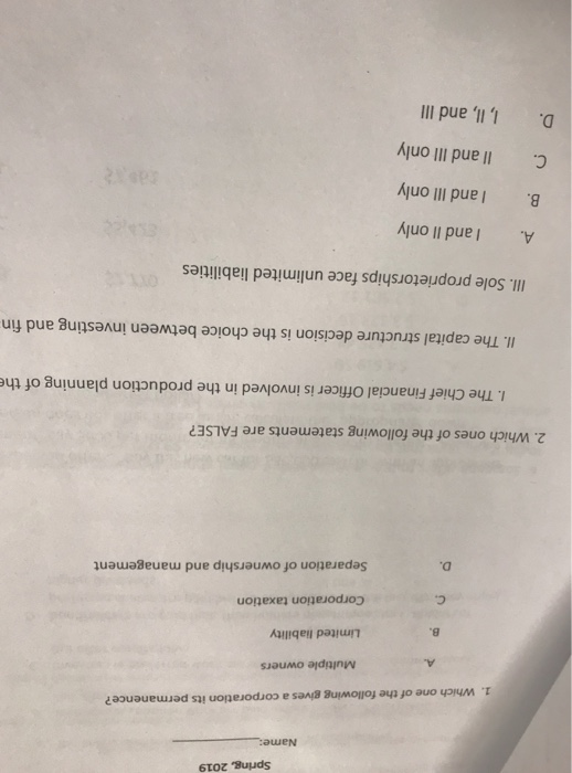 Solved Spring 2019 Name 1 Which One Of The Following Gives Chegg Com